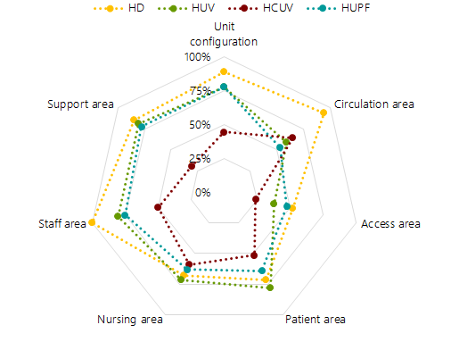 Para cada indicador se evalúa si se cumple, no se cumple o no procede. Si se cumple, el indicador suma un punto, si no se cumple no suma nada, y los indicadores que no proceden no computan en el porcentaje final. Cuando se completa la evaluación de todos los indicadores de todos los locales de cada área, con la herramienta se obtiene un gráfico radial. Cuanta más superficie tiene el gráfico, mejor es la puntuación obtenida. Además, la puntuación está diferenciada por áreas, que se corresponden a cada vértice del gráfico para poder analizar con más detalle los resultados en cada una de ellas. Al analizar la misma unidad en hospitales distintos, se obtiene un gráfico comparativo en el que se solapan los resultados finales de cada caso. De esta forma, gráficamente se pueden detectar dónde están los puntos débiles del diseño y priorizar qué indicadores se deben atender para mejorar la calidad funcional y ambiental de la unidad evaluada.